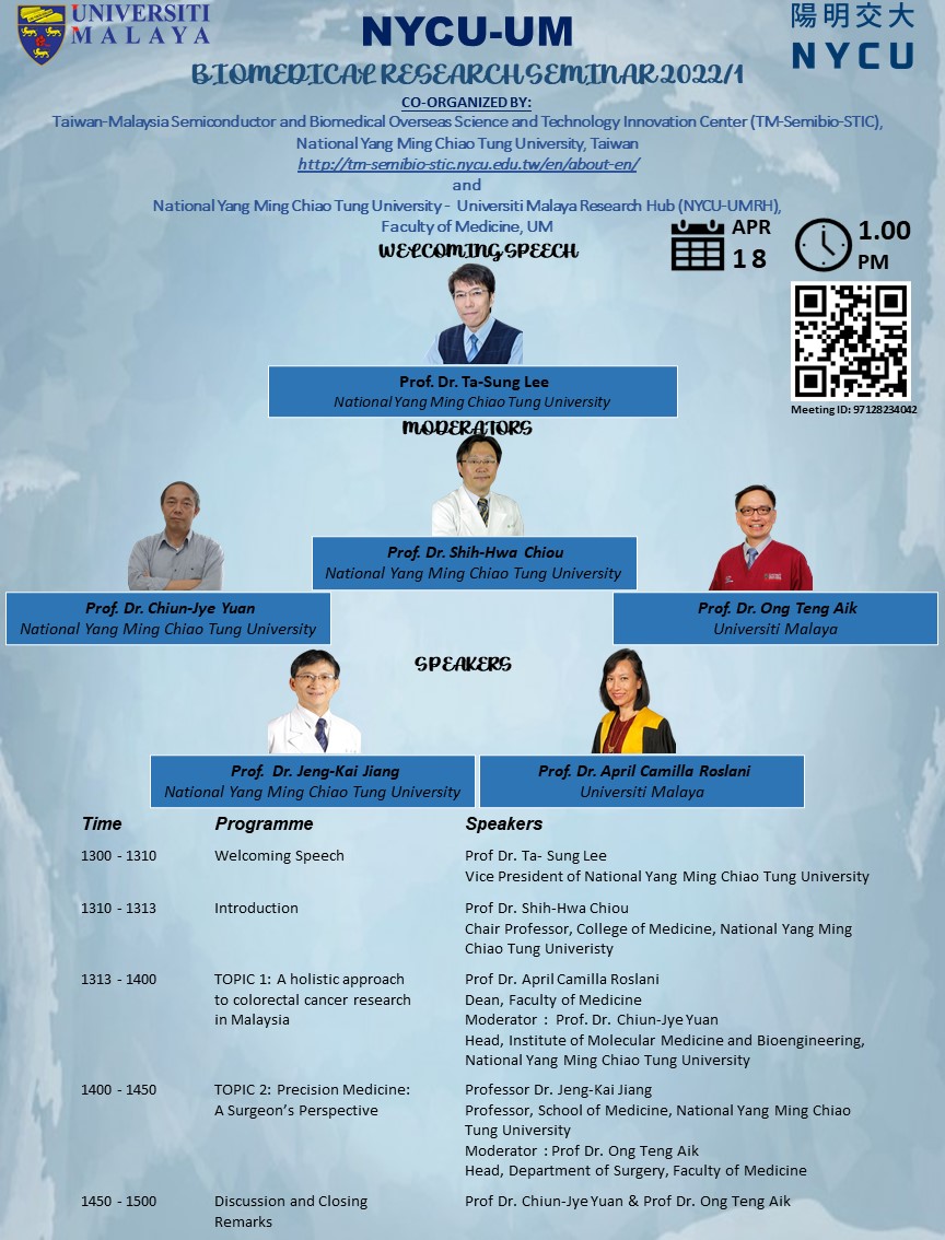 「Biomedical Research Seminar 2022 (co-organized by: University of Malaya and NYCU)」live webinar details are as follow:
